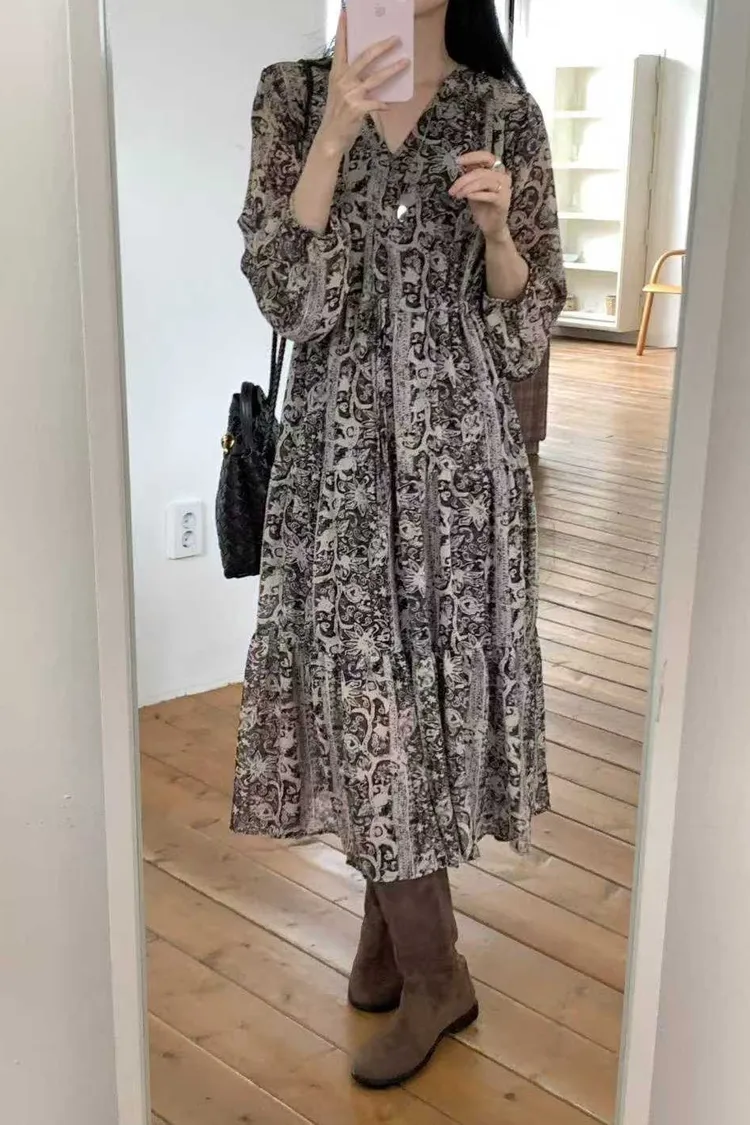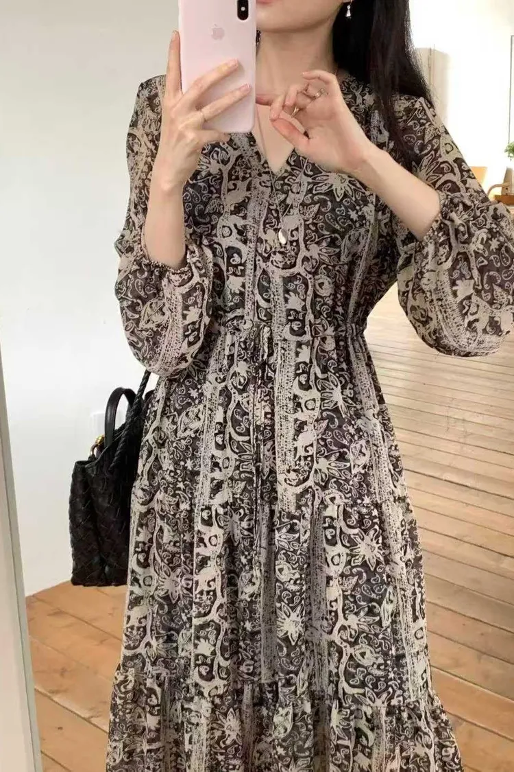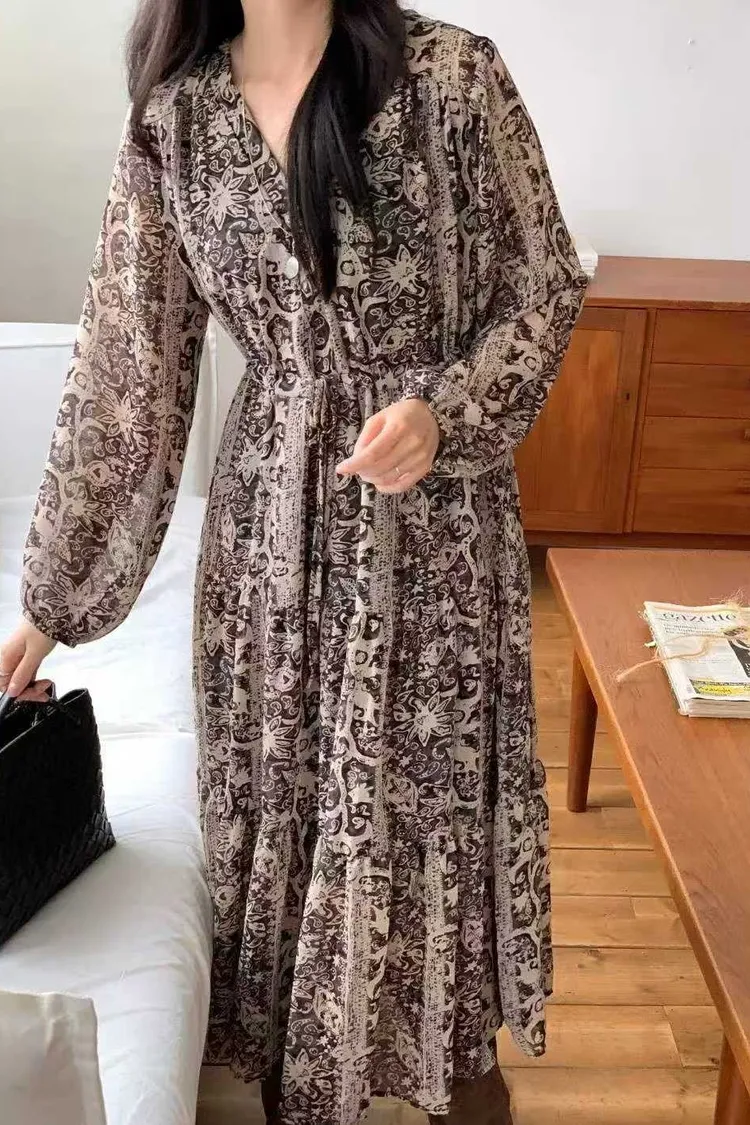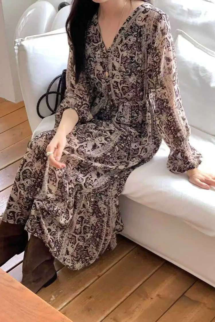2211 V領雪紡印花洋裝